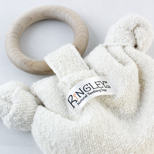 Ringley teething toys are made with untreated, well-crafted maple wood and fine certified organic terrycloth cotton. Made in Canada.