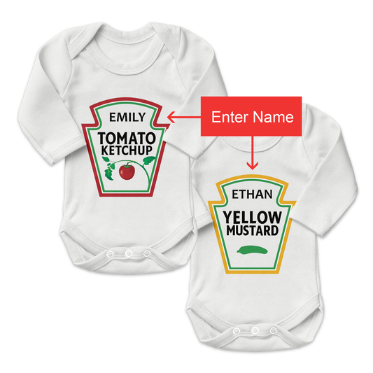 Personalized Organic Baby Bodysuit Set - TWIN Ketchup (White & White)