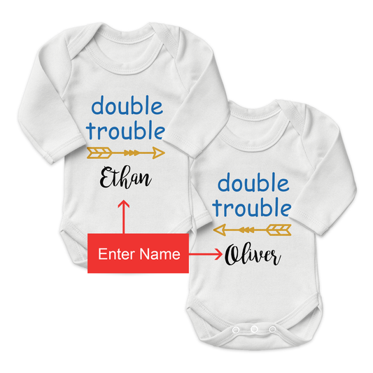 Personalized Organic Baby Bodysuit Set - TWIN Double Trouble (White & White)