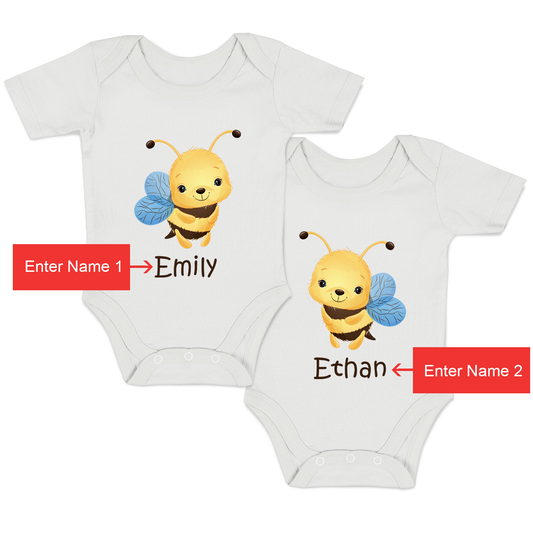 Personalized Organic Baby Bodysuit Set - TWIN Bees (White & White)