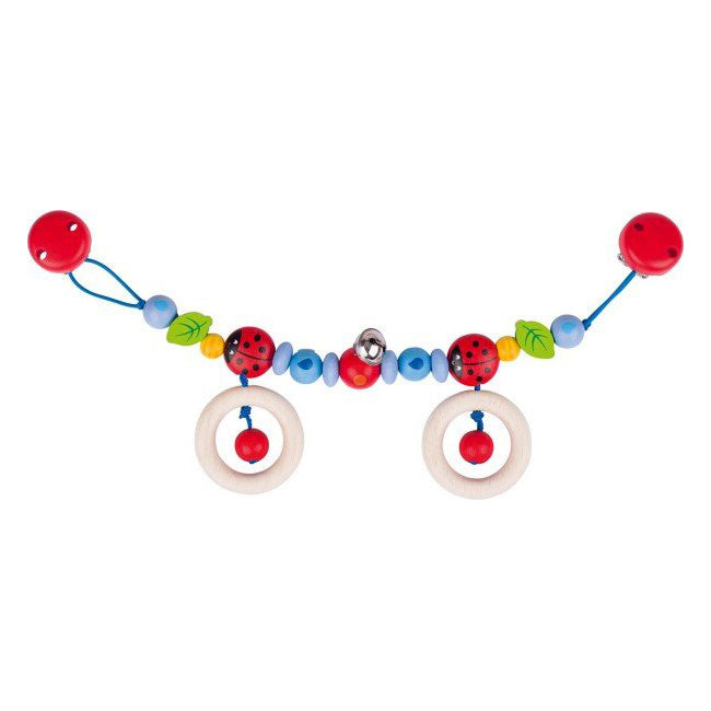 This stroller chain attaches easily to the sides of the stroller roof. The bright colours, shapes and the bell keeps the baby engaged.