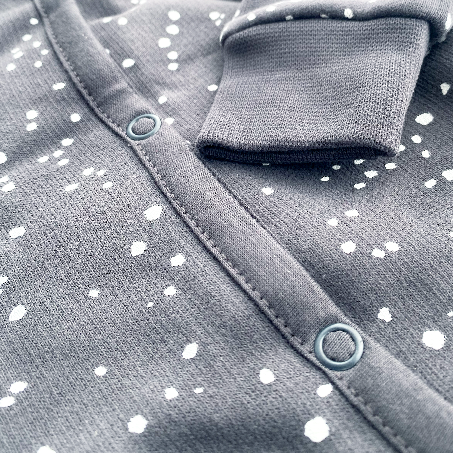 Such a great romper. Cozy brushed fleece with long sleeves and cuffs at wrist and ankle. Easy access through front snaps. The spots print is inspired by the New Zealand Pohutakawa Leaf. A wardrobe essential this romper favorite has the most incredibly soft brushed fleece on the inside.