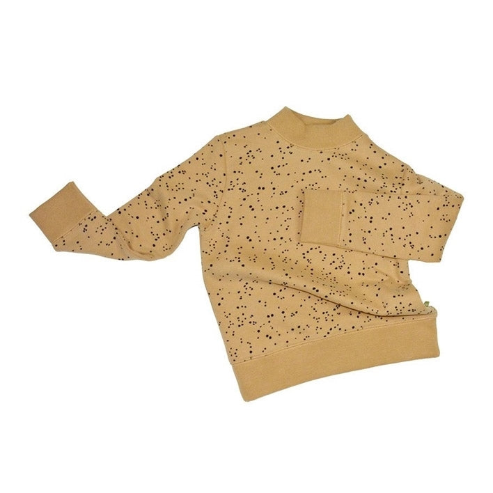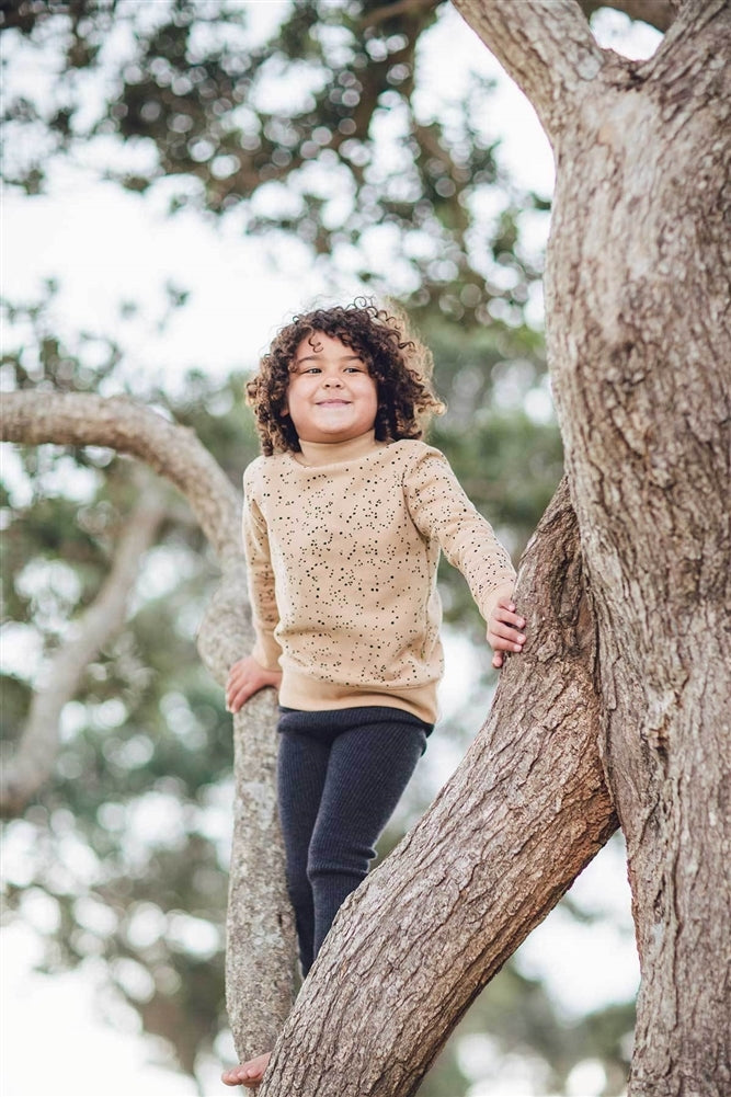Cozy brushed fleece longsleeve top with spots print inspired by the New Zealand Pohutakawa Leaf. A wardrobe essential this longsleeve organic top has the most incredibly soft brushed fleece on the inside. Infant sizes have snaps one one shoulder so they can get on/off baby heads easier.