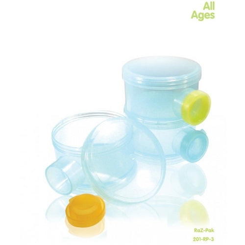 The Raz-Pak container offers a healthy and clean way to store snacks and formula powder, whether at home or on-the-go. Its three containers can connect together or be used separately, providing flexibility to meet each family’s needs. Perfect for holding formula, vitamins, or snacks like raisins, cereal, or special treats.