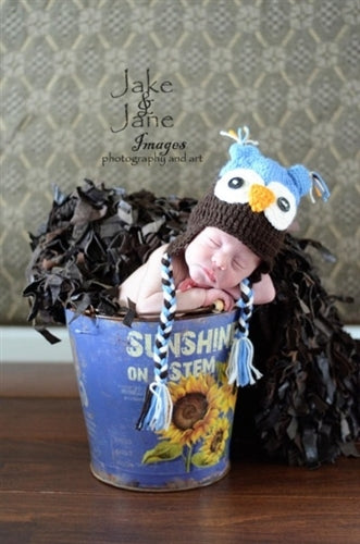 Rows of bright colors are fun and cheery for our owl hat. The ear is adorned with a lil yellow flower with a wood button in the center.