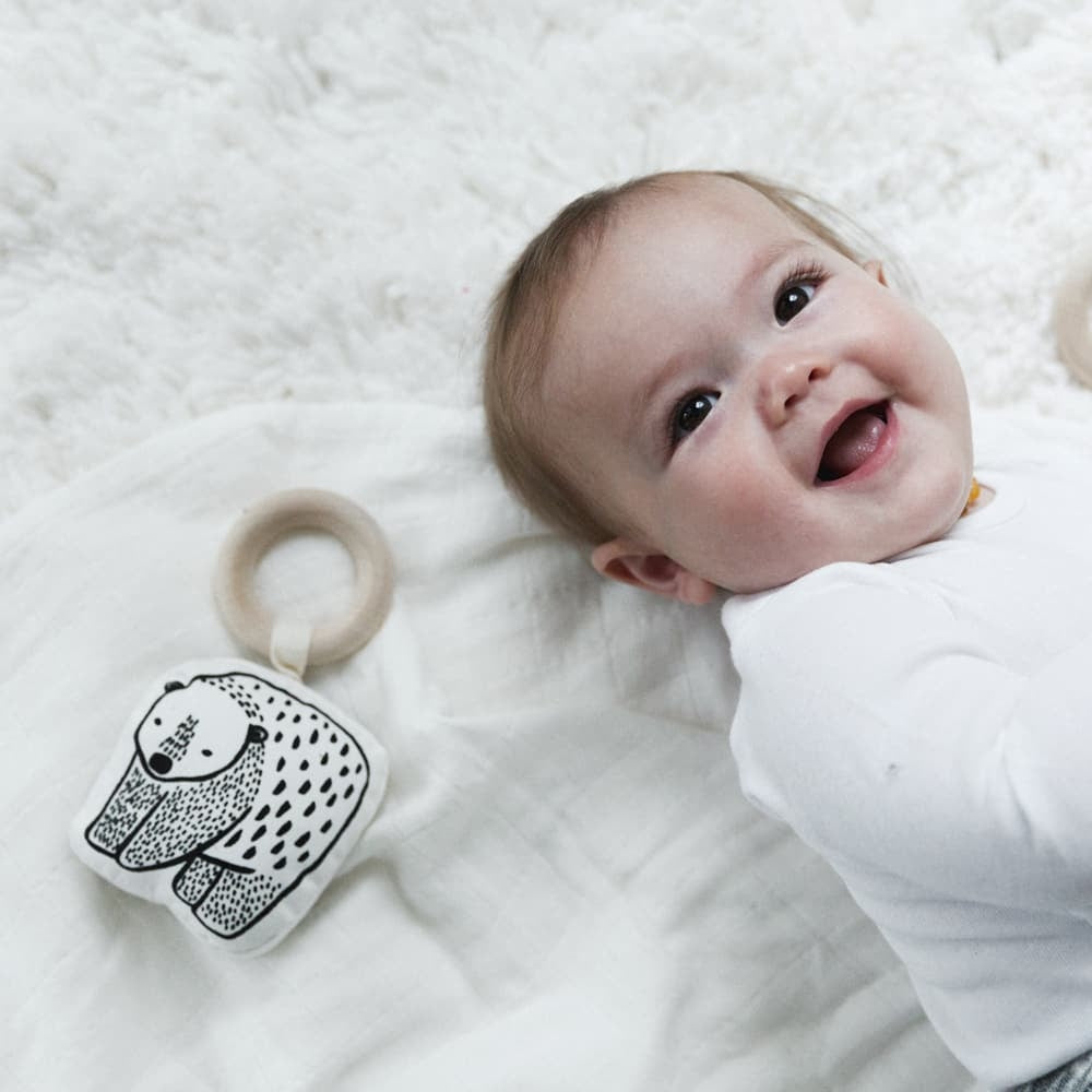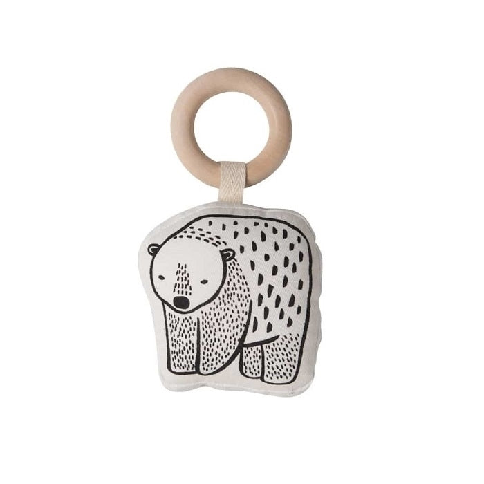 This Bear rattle is a sensory delight for your little one. The rattle provides audio stimulation, the screen printing gives it varying textures and the sustainably harvested maple ring is perfect for drooling on.
