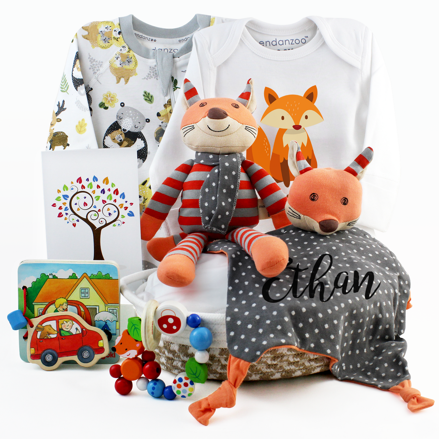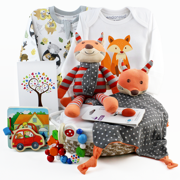 Delight a newborn with the charm of the forest. This fox-themed eco-friendly basket features cuddly organic essentials, personalized keepsakes, and playful wooden toys — perfect for a wild and wonderful start.