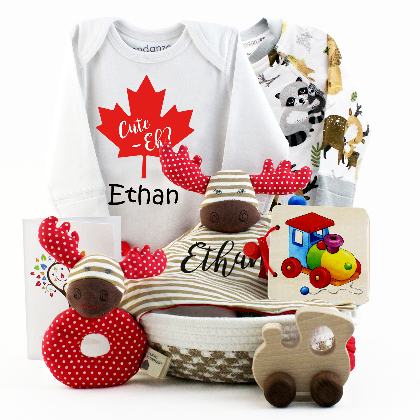 Celebrate a little one with a gift inspired by Canadian charm and natural beginnings. Featuring a personalized moose blankie, organic essentials, and eco-friendly toys — all beautifully wrapped in zero-waste style.