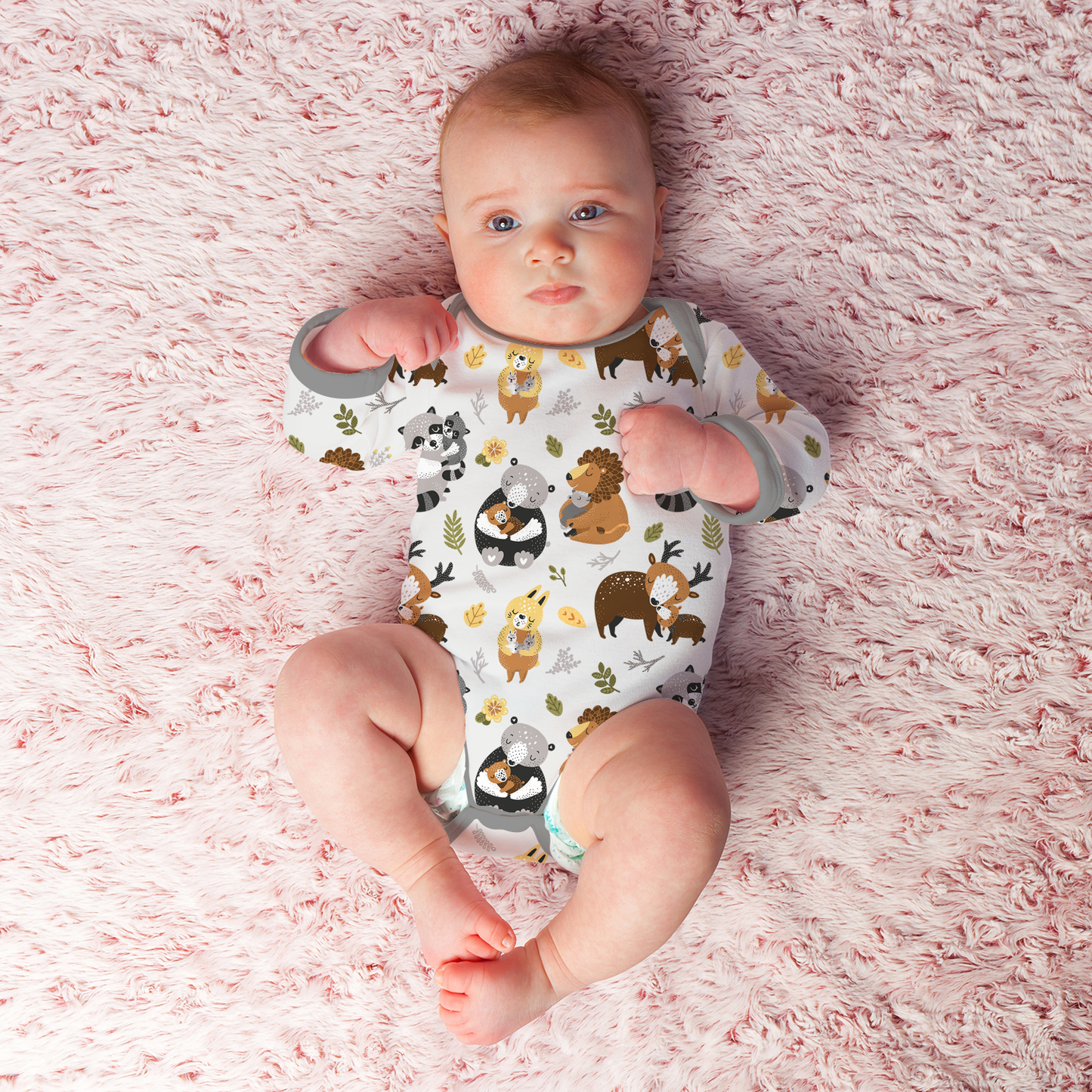 Personalized with Baby's Name. This organic blankie is ultra soft and great for babies to hug. It's GOTS certified organic cotton, low impact fabric dye and the filler is 100% naturally hypoallergenic corn fiber. - Endanzoo Classic Snuggle Organic Long Sleeve Double Zippered Romper - Safari Hugs