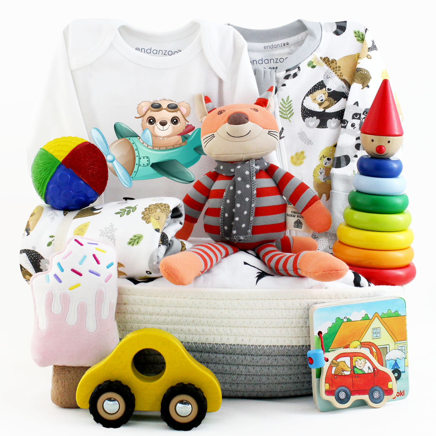 Ready for takeoff into cuteness! This dreamy gift basket has everything for baby’s first holiday — soft organic outfits, travel-ready toys, and sweet personalized touches. Snuggles, smiles, and sustainability included!
