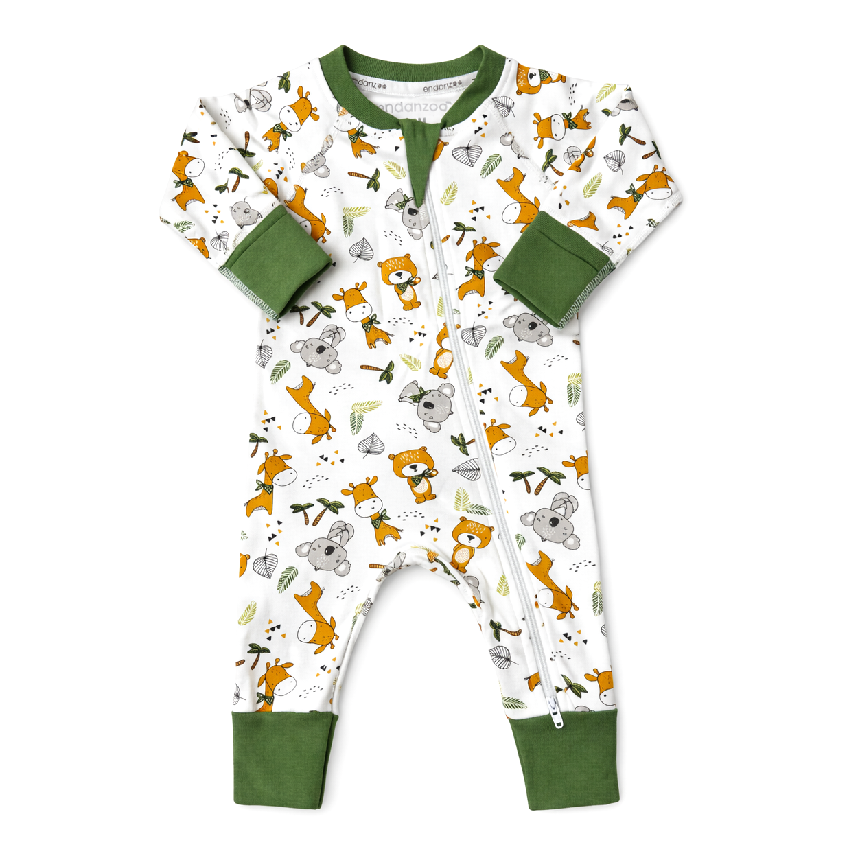 Personalized with Baby's Name. This organic blankie is ultra soft and great for babies to hug. It's GOTS certified organic cotton, low impact fabric dye and the filler is 100% naturally hypoallergenic corn fiber. - Endanzoo Classic Snuggle Organic Long Sleeve Double Zippered Romper - Jungle Cuties