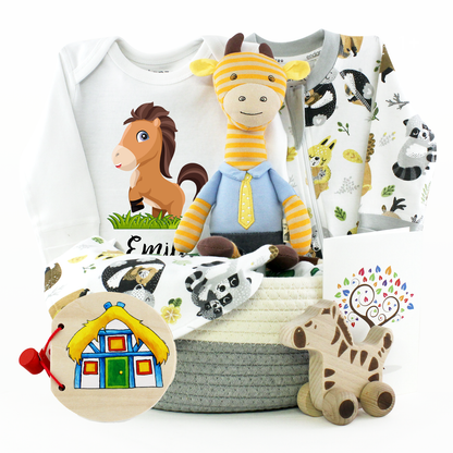 Giddy up for giggles! Our Little Horse gift basket is packed with farmyard charm—think cozy rompers, a huggable giraffe, and a trotting zebra toy. It’s a rootin’-tootin’ ride into cuddles, curiosity, and eco-friendly fun!