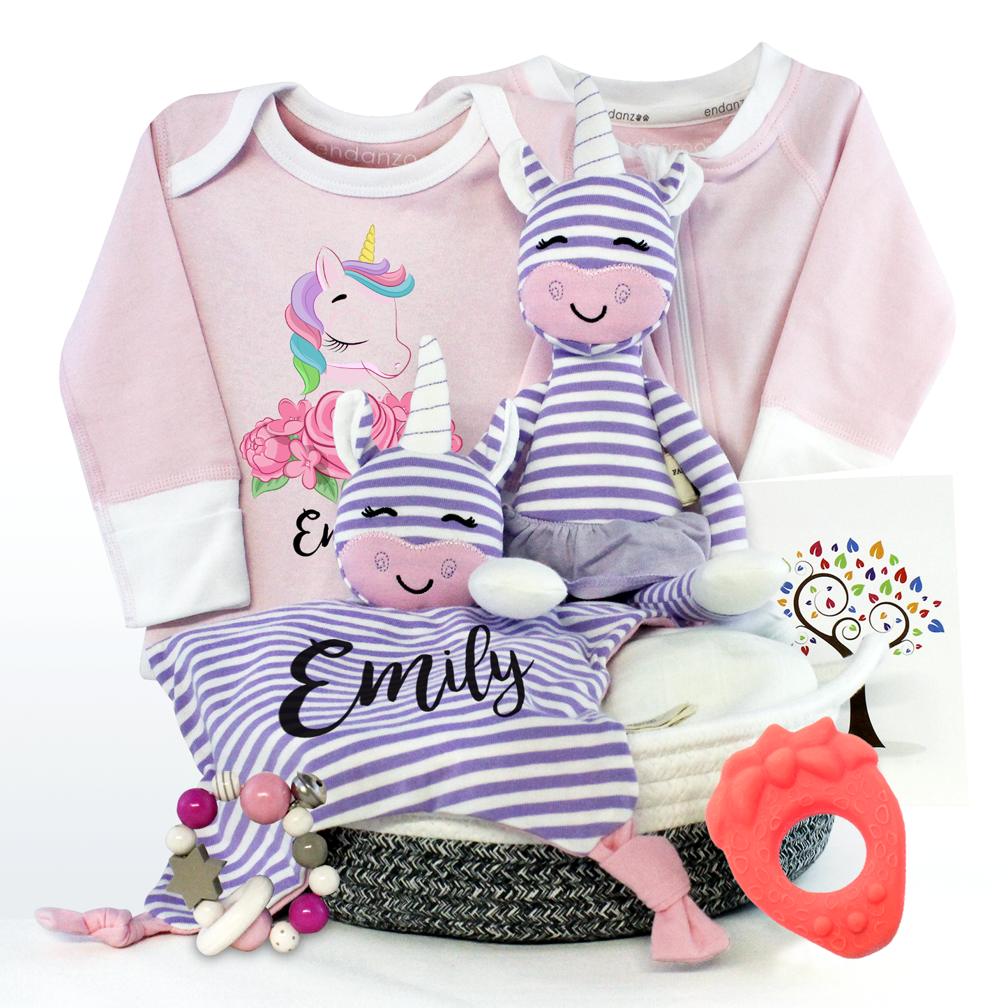 Step into a world of wonder with this unicorn-themed gift basket for a newborn girl. Featuring a personalized unicorn blankie, plush companion, and soft organic essentials. Wrapped in zero-waste style, it’s a magical welcome rooted in love and sustainability.