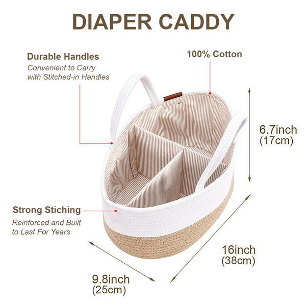 This Diaper Caddy is of classic and timeless design. Made with 100% Cotton Rope, this caddy has multiple uses- a storage basket for baby essentials, a pumping station or as a toy basket. - Greeting Card + Tag