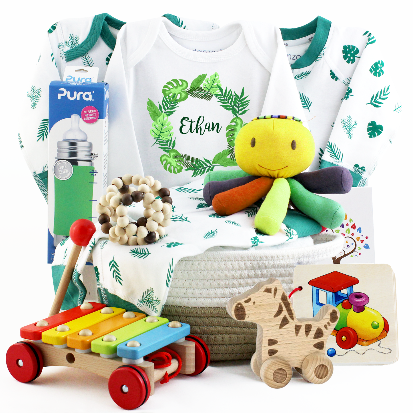 You can add the Baby's name to make it special and memorable. Any personalized items in this basket will be printed in-house in Toronto with eco-friendly water-based inks using state-of-the-art DTG printing method. There will be an absolutely zero hand-feel on the personalized print (i.e. No Vinyl or any hard coating!).