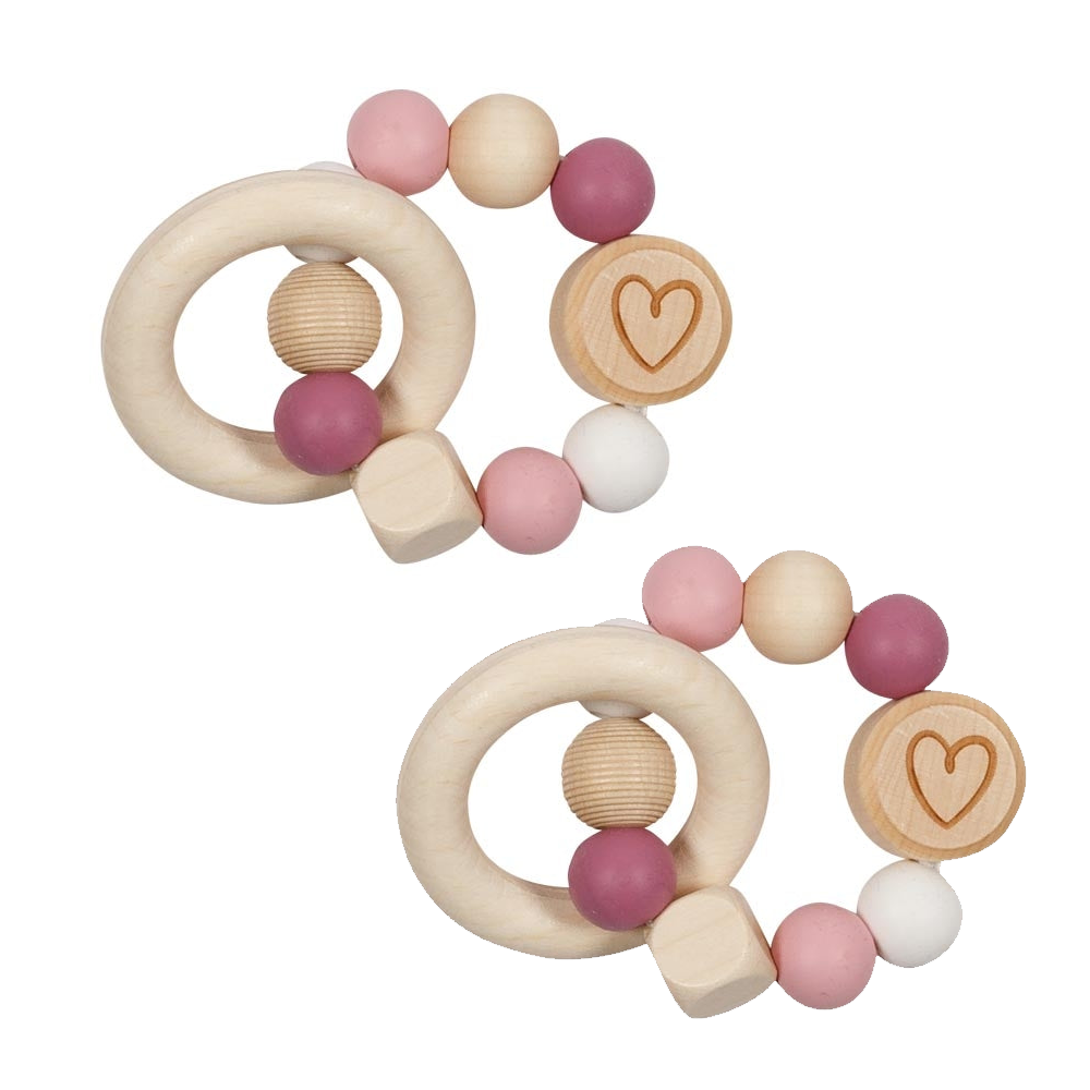 These cute organic cotton toy gently rattles with a little shake. The filler is 100% naturally hypoallergenic corn fiber. Low impact fabric dyes. - 2 x Goki Wooden Rattles - Touch Ring Elastic Pink